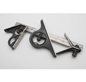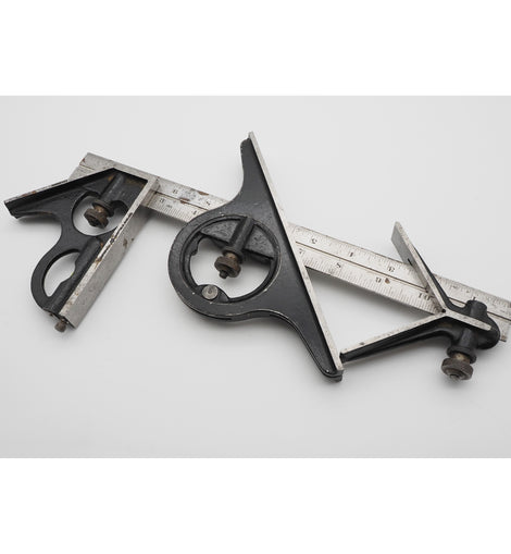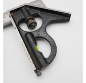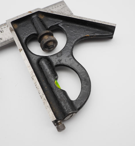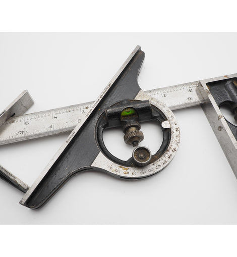 Superb condition and totally complete and original 12" long combination square with ALL attachments. All the bubbles are in tact and the square attachment also has its original awl which is rare to find now-a-days. The whole thing is in real;ly good condition. Made by Chesterman of Sheffield