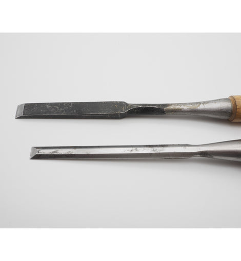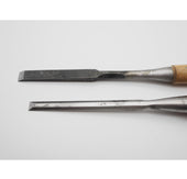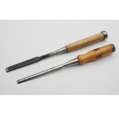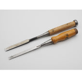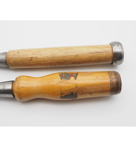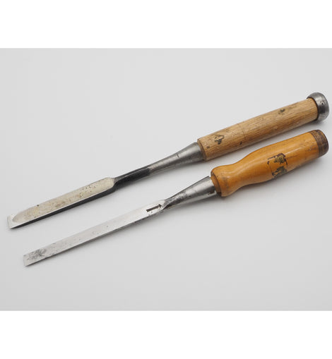 Two good clean socket chisels with wooden handles. 1/2" wide Japanedes one and a 3/8" belve-edged one by William Marples of sheffield. Both are in very good condition.
