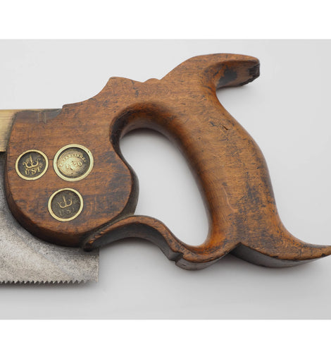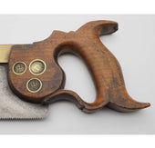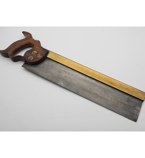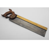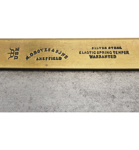 RARE 14" long heavy brass backed tenon saw by R. GROVES & SONS of SHEFFIELD. Fully enclosed beech handle with the three large brass medallion rivets including the ESTABLISHED 1770 badge. Pretty decent condition for its age. 2 1/2" depth. Mahogany tooth protector.