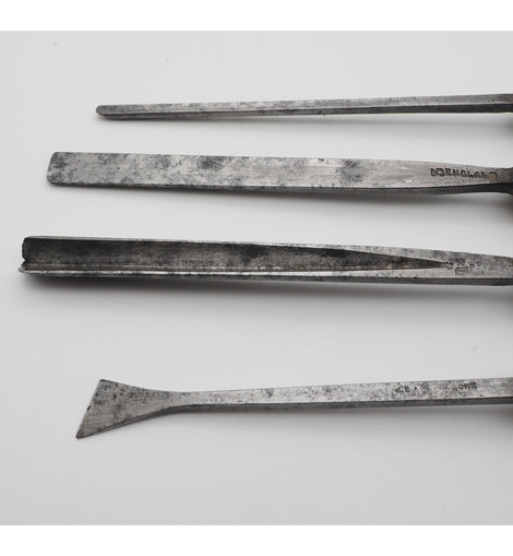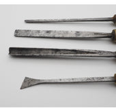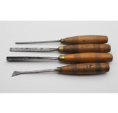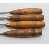 Reasonably decent set of 4 early S. J. Addis of London carving chisels with matching turned beech handles and brass ferrules. Sjapes and sizes as follows;