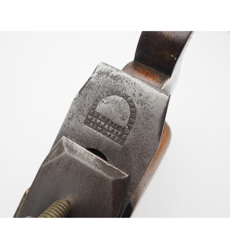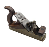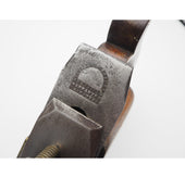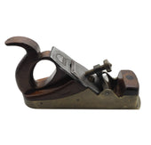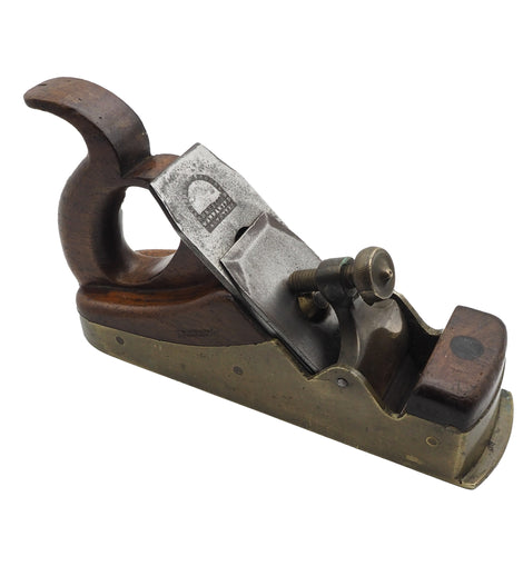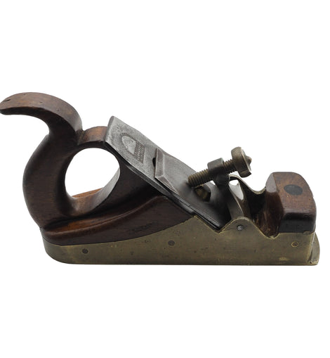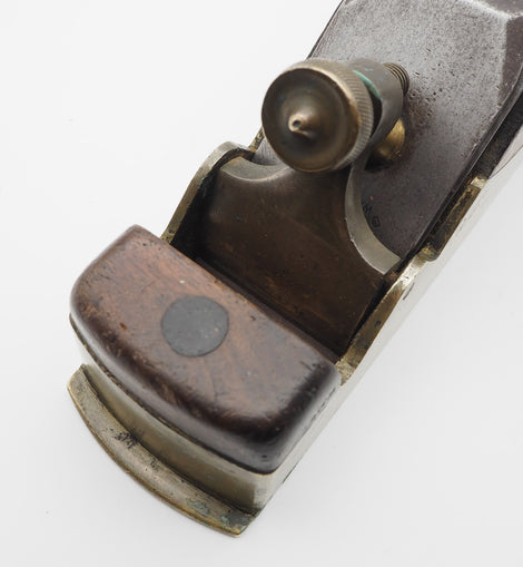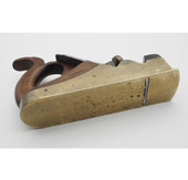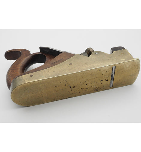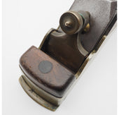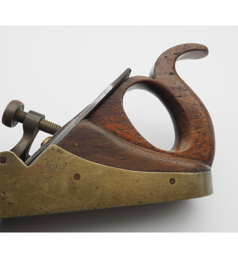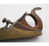 Superb 19th century Scottish GUNMETAL traditional pattern smoothing plane. Cove moulded front with curved rear and nice shape casting. Good over-stuffed walnut infill including large fully enclosed rear handle with lovely shape spur. Front bun has an ebony disk inlaid in the top centre. Good length thick parallel iron by Mathieson produces a fine mouth. 9" long. Really nice plane in good condition with the added bonus "IT DOESN'T RUST !!"