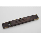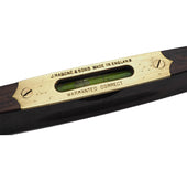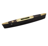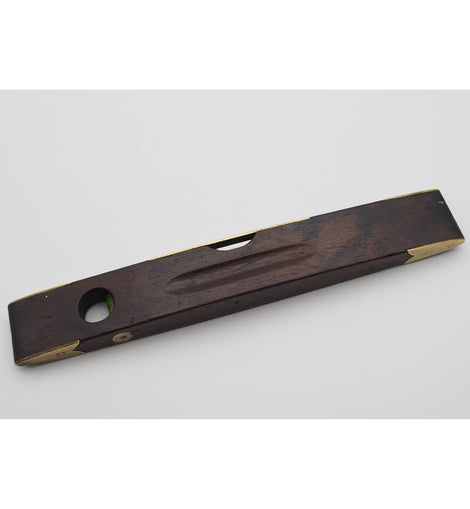 Decorative rosewood and brass inlaid boat-shaped level and plumb by John Rabone & Sons of Birmingham. Decorative top and feet with both original green bubbles. Good condition.