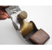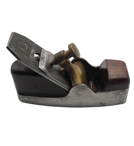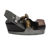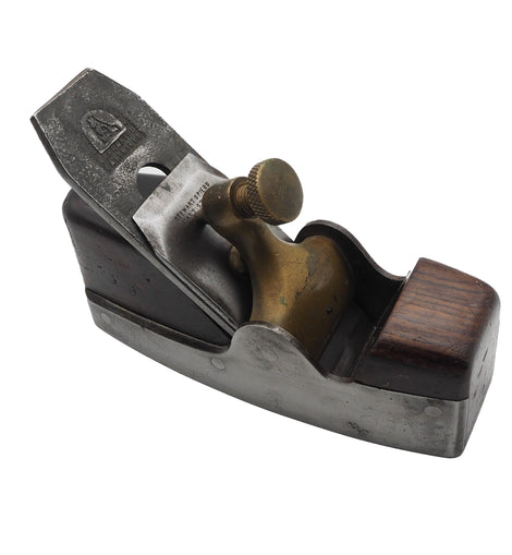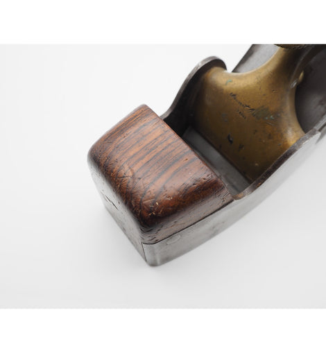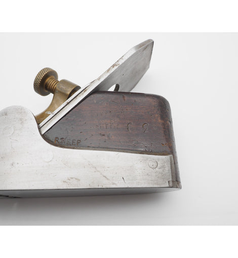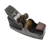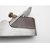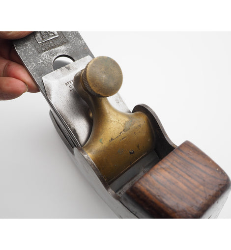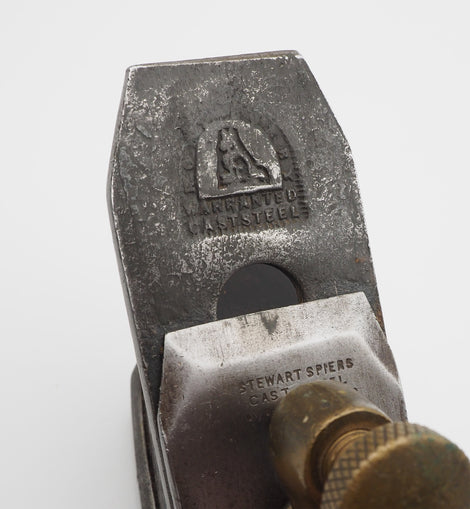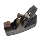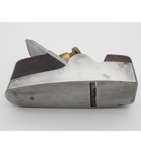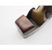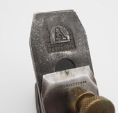 Fine clean Spiers of Ayr, coffin-shaped, dovetailed steel Unhandled pattern smoothing plane. Late 1920's vintage with scroll script stamp to the gunmetal lever cap. Really nice grained rosewood infill with original Spiers stampoed backing iron and what looks to me to be the original thick parallel iron by Robert Sorby which is cast steel and produces a fine mouth. 7 1/2" long. This is a really nice example of this design Spiers smoothing plane.