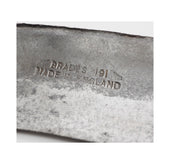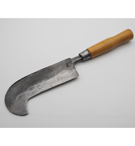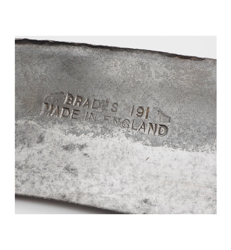 Pretty decent Brades of England No. 191, 8" billhook with original beech handle. Blade is in good condition with good depth and very little pitting. There is a minor hairline crack to the handle. 15 1/2" long overall. Metal handle ferrule is also stamped Brades.